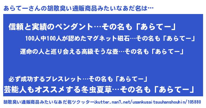 | 意味不明あだ名 | 『あらてーフォーエバー』『自称あらてー』 |