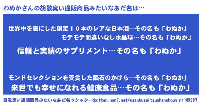 | ポケモン風あだ名 | 『ヒワヌカ』『ワーヌイ』『ゼニワヌ』 |