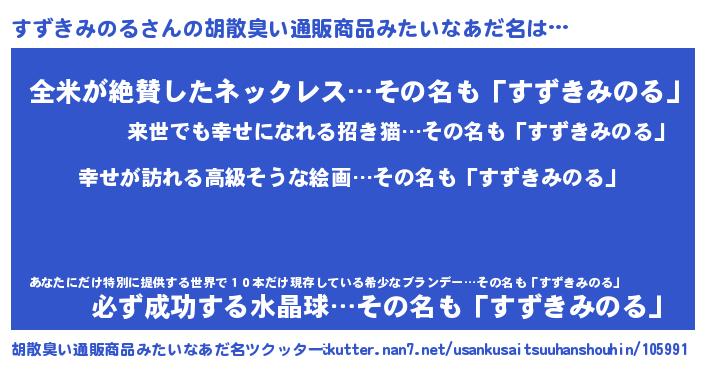 | 男性向けラノベタイトル風あだ名 | 『やはりすずきみのるの青春ラブコメはまちがっている 』 |