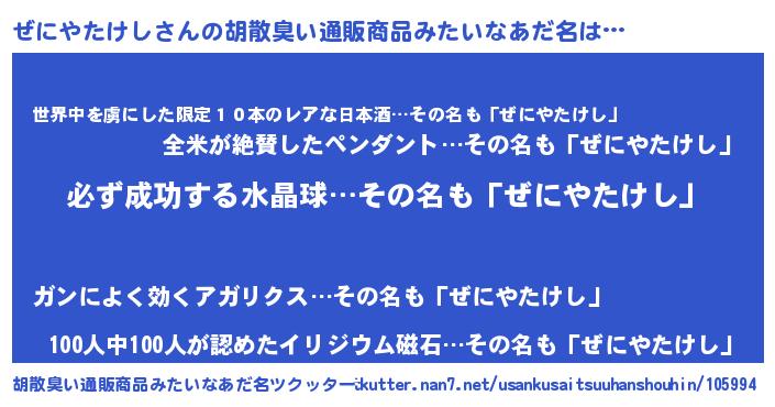 | 男性向けラノベタイトル風あだ名 | 『ぜにやたけしの憂鬱』 |
