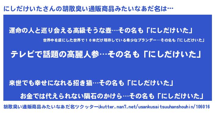 | 意味不明あだ名 | 『自称にしだけいた』 |
