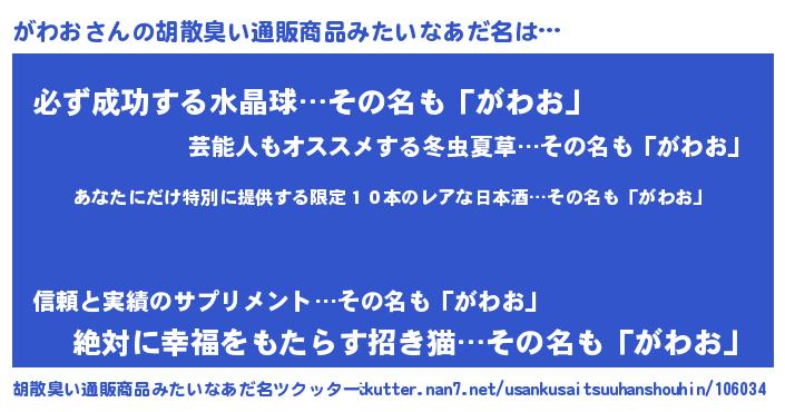 | 男性向けラノベタイトル風あだ名 | 『この素晴らしい世界にがわおを!』 |