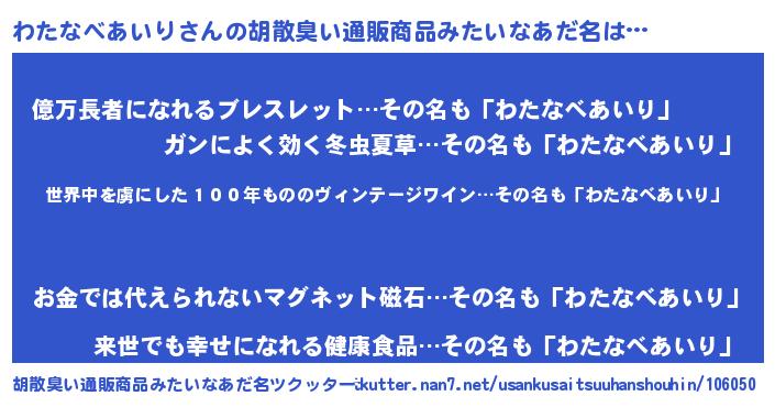 | 欧米人風あだ名 | 『アンジェラ・わたなべあいり』 |