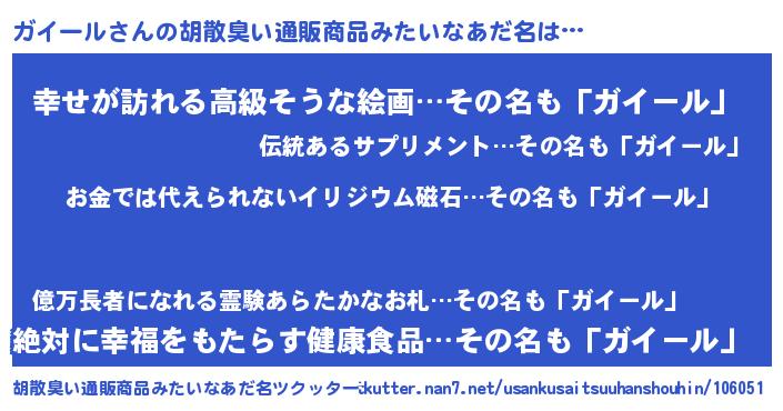 | ヘコむあだ名 | 『なまこ酢』『ガイール(小並感)』 |
