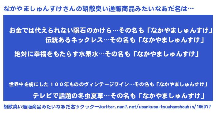 | ヘコむあだ名 | 『なかやましゅんすけ(震え声)』『豆乳』 |