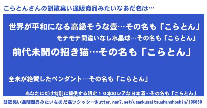 | 男性向けラノベタイトル風あだ名 | 『こらとんに滅ぼされるだけの簡単なお仕事です』 |