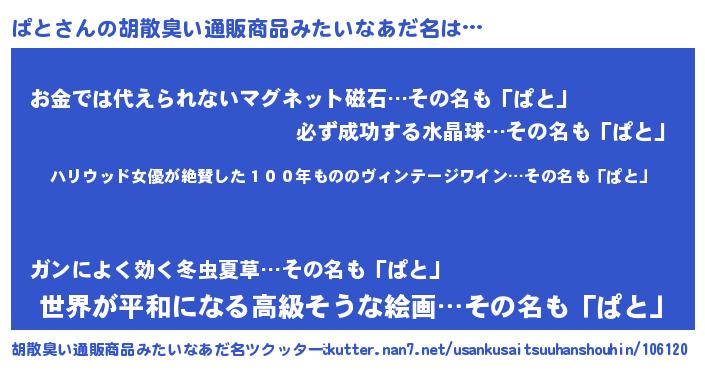 | 意味不明あだ名 | 『住所不定無職ぱと(3歳)』『ペロリンぱと』 |
