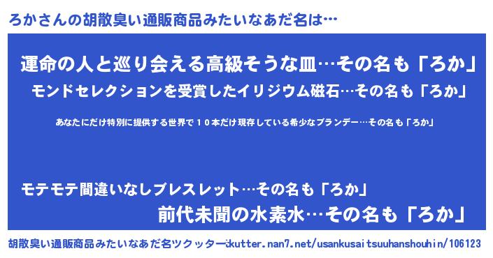 | 男性向けラノベタイトル風あだ名 | 『この素晴らしい世界にろかを!』 |