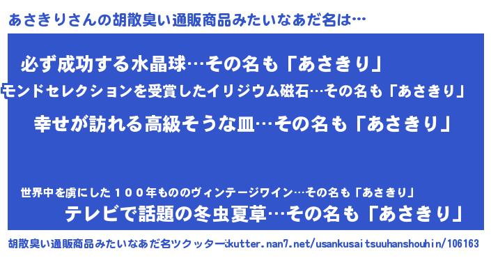 | 女子向けラノベタイトル風あだ名 | 『あさきりの雑貨屋さん』『闇のあさきり』 |