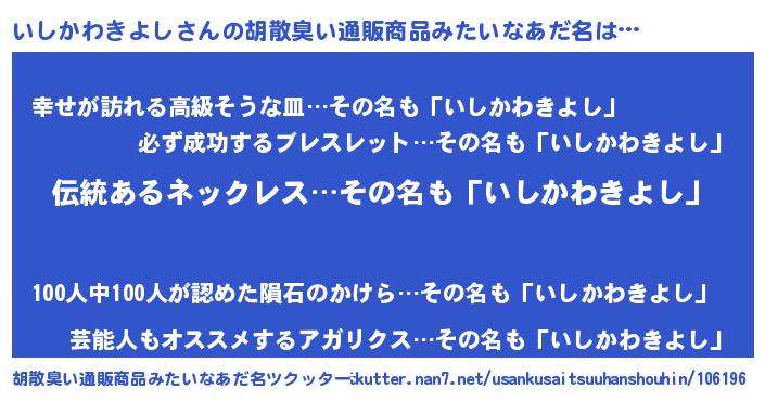 | 男性向けラノベタイトル風あだ名 | 『転生したらいしかわきよしだった件』 |