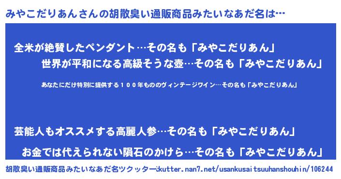 | 意味不明あだ名 | 『住所不定無職みやこだりあん(12歳)』 |