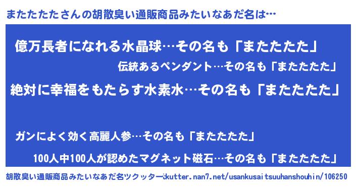 | 男性向けラノベタイトル風あだ名 | 『またたたたという概念が存在しない退屈な世界 』 |