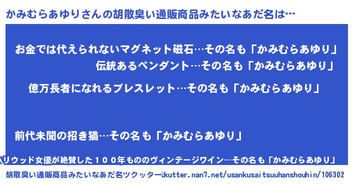| 男性向けラノベタイトル風あだ名 | 『かみむらあゆり~年齢イコール彼女いない歴の魔法使い~』 |