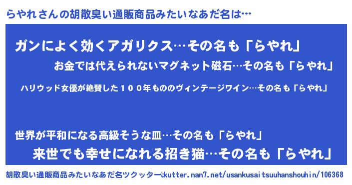 | ヘコむあだ名 | 『らやれ(小並感)』『つくし』 |
