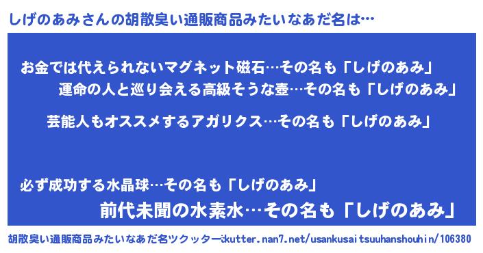 | 意味不明あだ名 | 『自称しげのあみ』『永久保存しげのあみ』 |