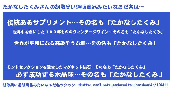 | 意味不明あだ名 | 『たかなしたくみフォーエバー』 |