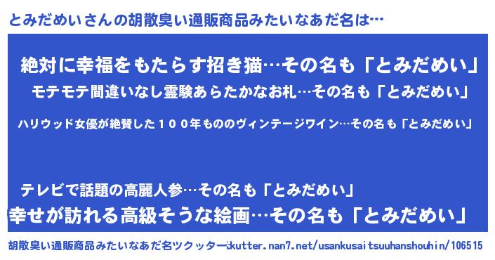 | 意味不明あだ名 | 『住所不定無職とみだめい(10歳)』 |