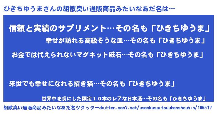 | ヒーロー風カッコイイあだ名 | 『愛の使者ひきちゆうま』『暗黒騎士ヒキ』 |