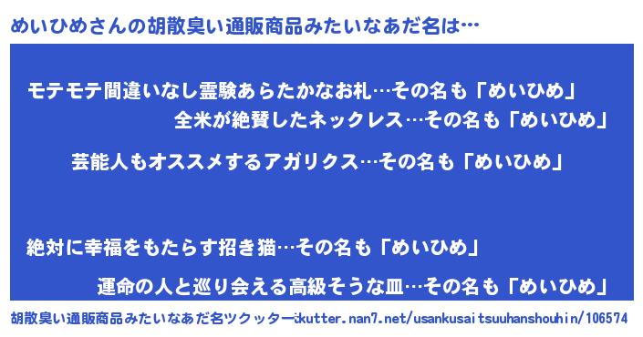 | ヘコむあだ名 | 『めいもー』『なまこ酢』『めいっぺ』 |