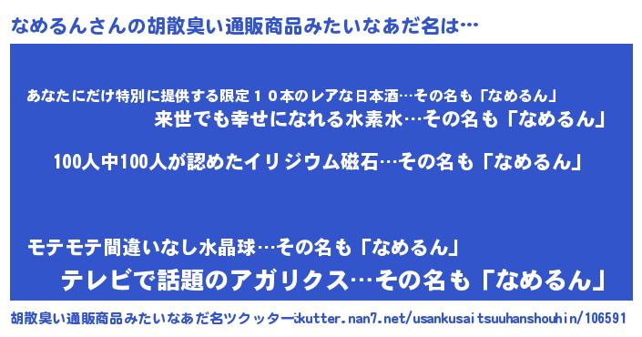 | 男性向けラノベタイトル風あだ名 | 『緋弾のナメルン』『魔弾の王となめるん』 |