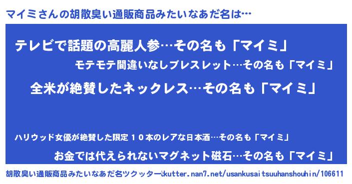 | 欧米人風あだ名 | 『ウサインマイミ』『ケンブリッジマイミ』 |