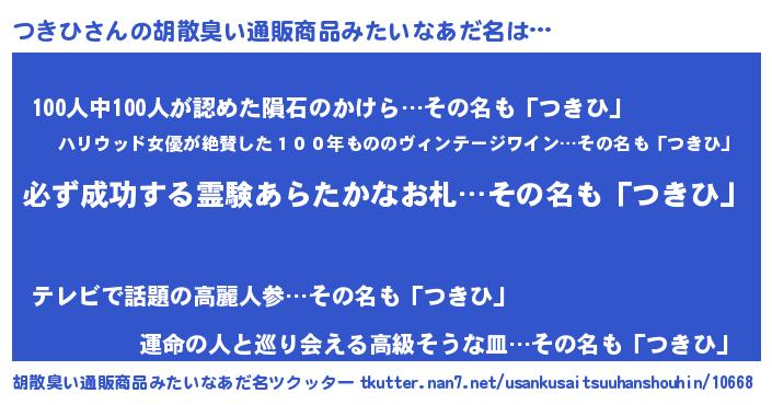 | 男性向けラノベタイトル風あだ名 | 『つきひの憂鬱』『はたらくつきひさま!』 |