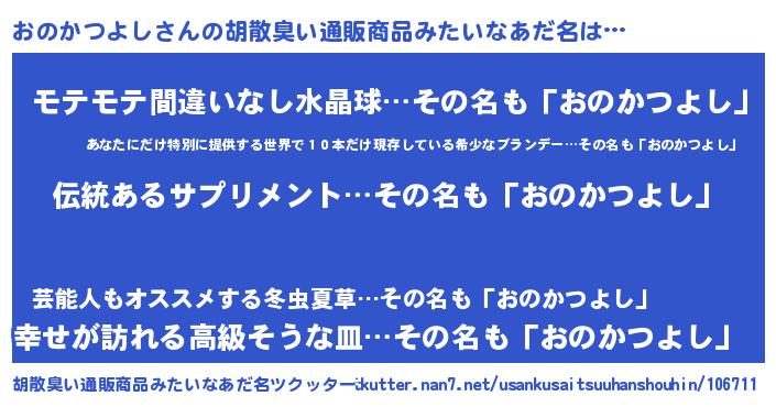 | 男性向けラノベタイトル風あだ名 | 『おのかつよしの嫁は女の子じゃないと思った?』 |