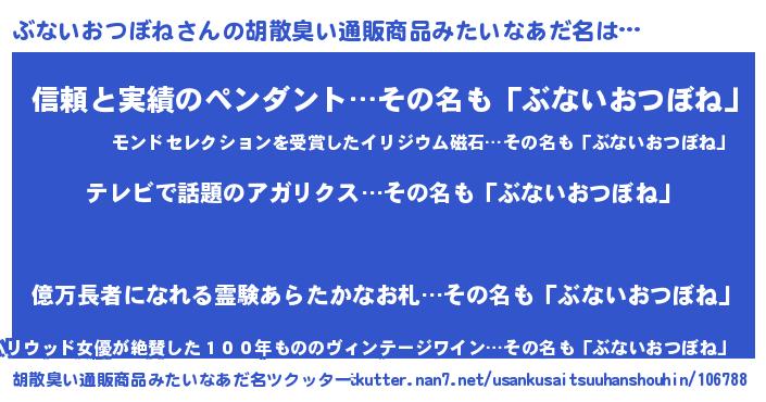 | 恥ずかしいあだ名 | 『ブナイオツボネデラックス』『ぶなちん』 |