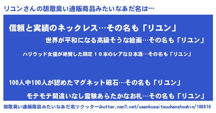 | 意味不明あだ名 | 『住所不定無職リユン(62歳)』 |