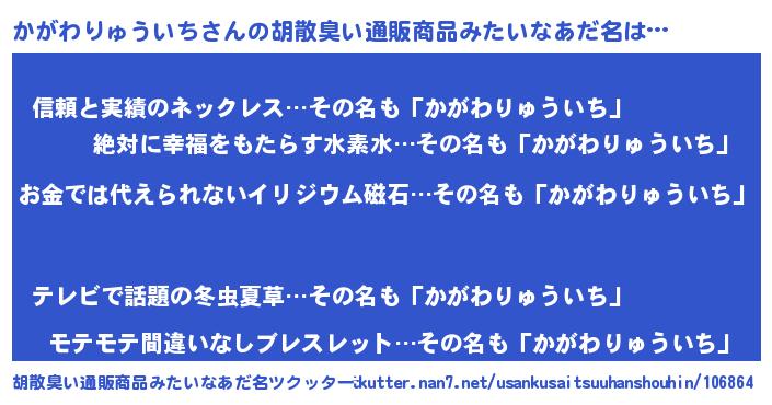 | ポケモン風あだ名 | 『カックウザ』『ヒカガワリュウイチ』 |