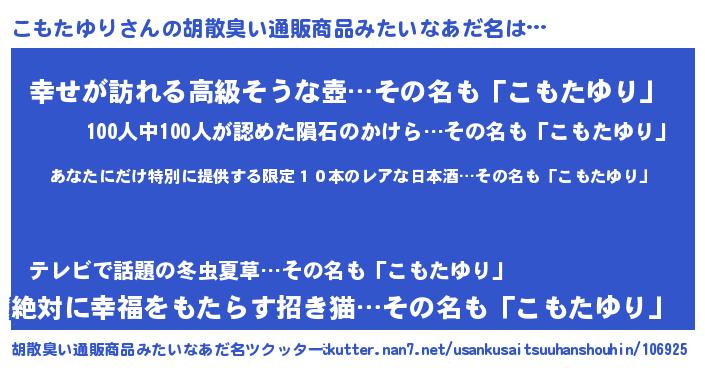 | 男性向けラノベタイトル風あだ名 | 『こもたゆり~年齢イコール彼女いない歴の魔法使い~』 |
