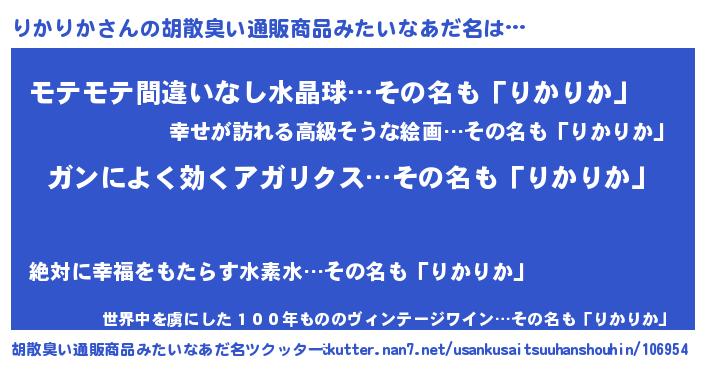 | ヘコむあだ名 | 『りかにゅー』『なまこ酢』『りかを』 |