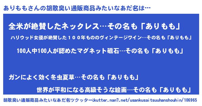 | 欧米人風あだ名 | 『ダニエルありもも』『ウサインありもも』 |