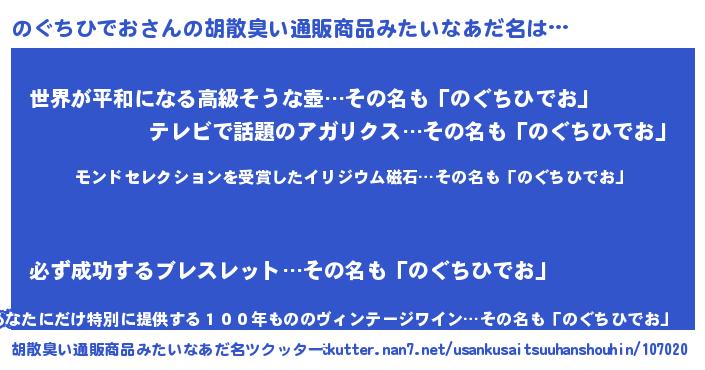 | 男性向けラノベタイトル風あだ名 | 『ノーゲーム・ノーノグチヒデオ』 |