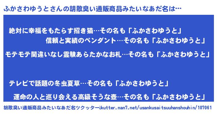| ヘコむあだ名 | 『ふかもー』『ふかさわゆうと(笑)』 |