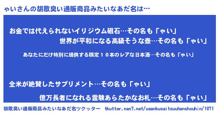 | ヒーロー風カッコイイあだ名 | 『仮面ャイダー』『友情の使者ゃい』 |
