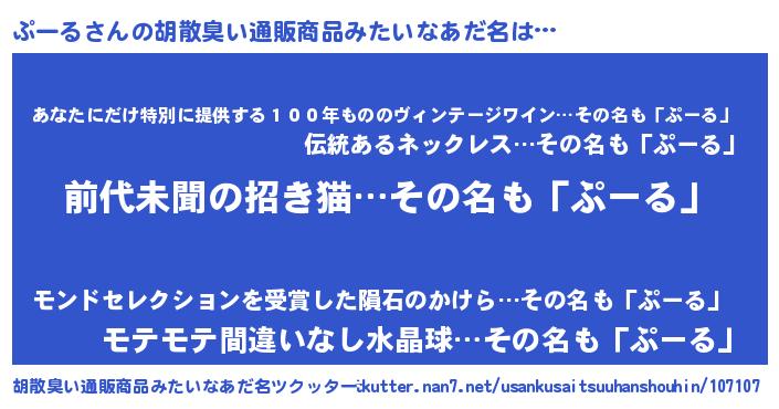 | 女子向けラノベタイトル風あだ名 | 『ぷーるの玉の輿計画!』 |