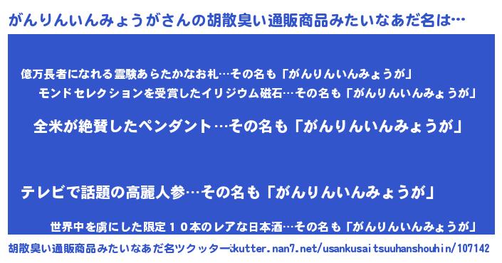 | 男性向けラノベタイトル風あだ名 | 『がんりんいんみょうがの嫁は女の子じゃないと思った?』 |
