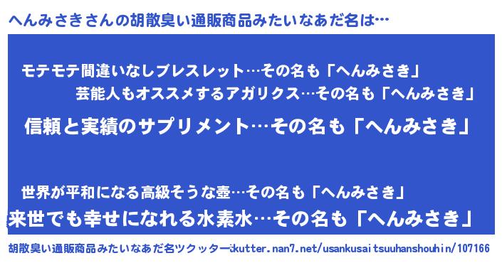 | 男性向けラノベタイトル風あだ名 | 『ヘンミサキスレイヤー』 |