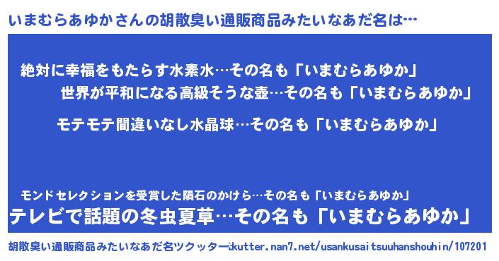 | ヘコむあだ名 | 『いまもー』『いまむらあゆか(震え声)』 |