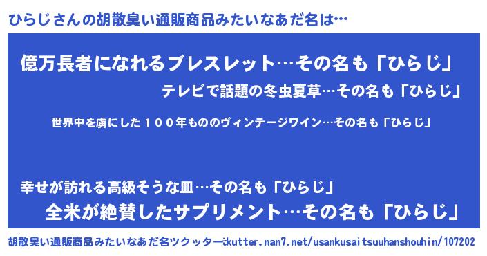 | 意味不明あだ名 | 『住所不定無職ひらじ(1歳)』『自称ひらじ』 |
