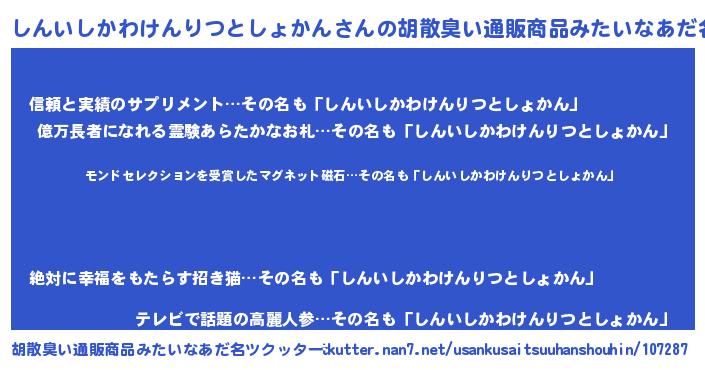 | 男性向けラノベタイトル風あだ名 | 『ノーゲーム・ノーシンイシカワケンリツトショカン』 |