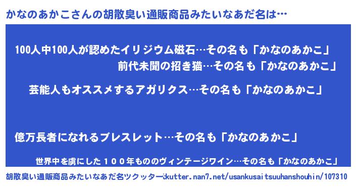 | ヘコむあだ名 | 『かなのあかこ(苦笑)』『かなもー』 |