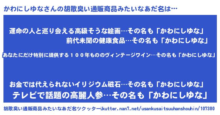 | 男性向けラノベタイトル風あだ名 | 『この素晴らしい世界にかわにしゆなを!』 |