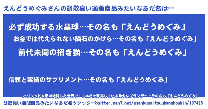 | ヘコむあだ名 | 『えんどうめぐみ(笑)』『えんにゅー』 |