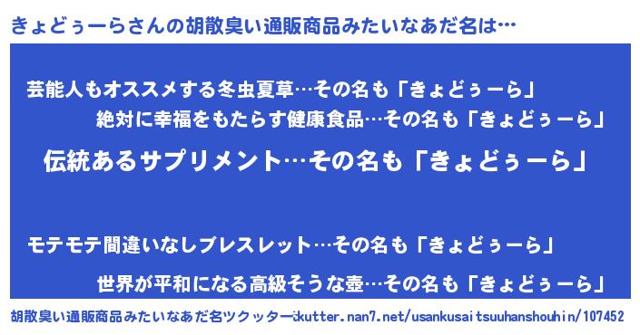 | 意味不明あだ名 | 『とにかく怪しいきょどぅーら』 |