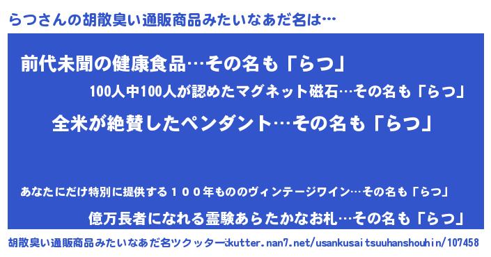 | ヘコむあだ名 | 『らつっちょ』『らつ(笑)』『豆乳』 |
