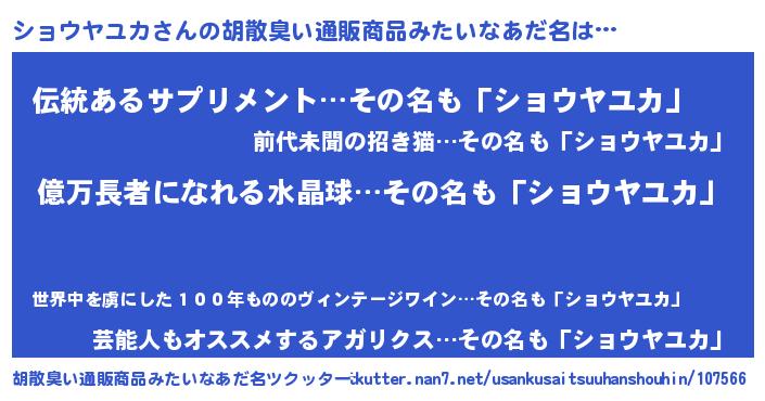 | 男性向けラノベタイトル風あだ名 | 『ショウヤユカ~年齢イコール彼女いない歴の魔法使い~』 |
