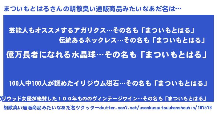 | 男性向けラノベタイトル風あだ名 | 『まついもとはる~年齢イコール彼女いない歴の魔法使い~』 |