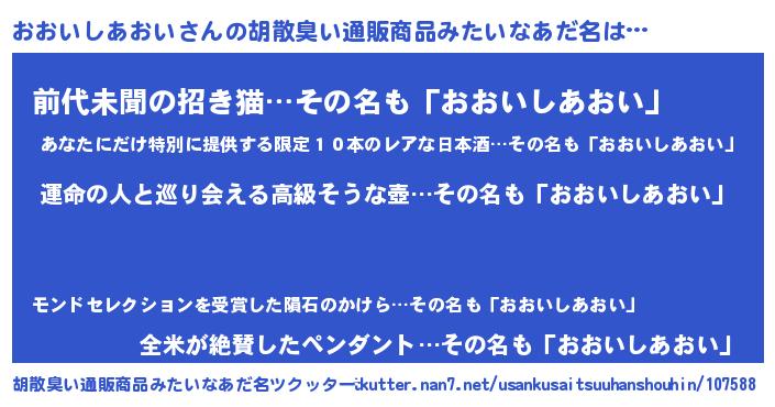 | 欧米人風あだ名 | 『アンジェラ・おおいしあおい』 |